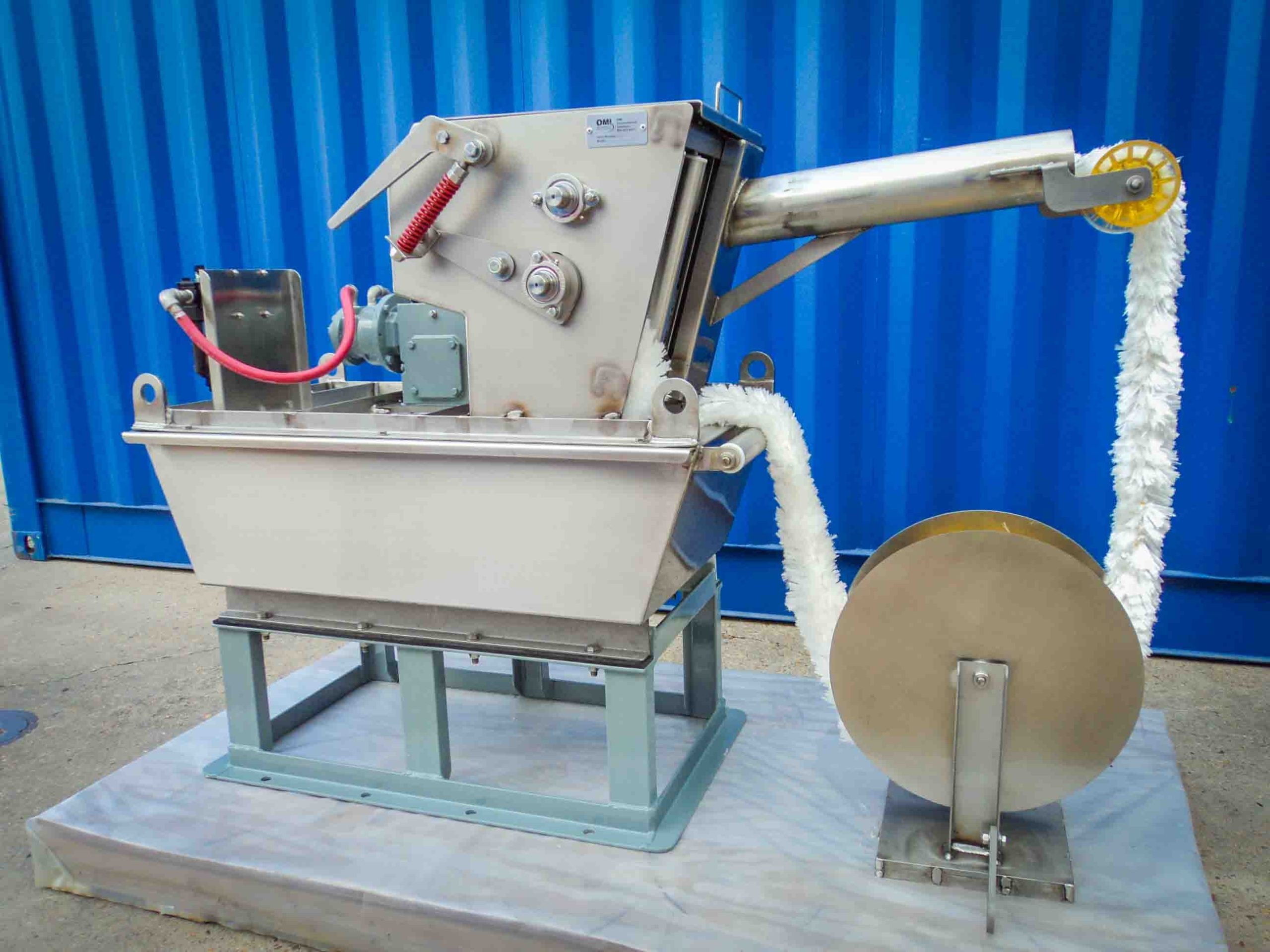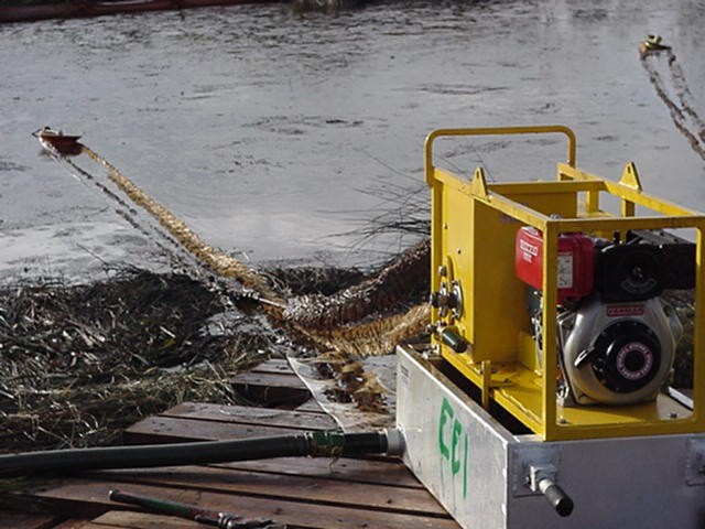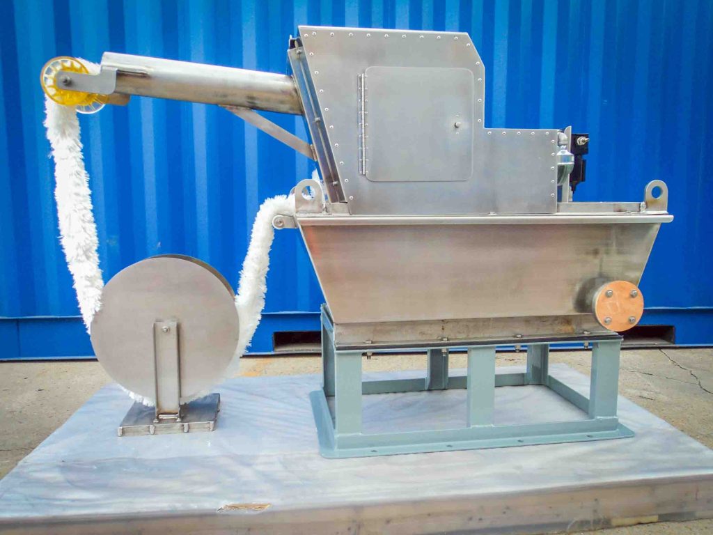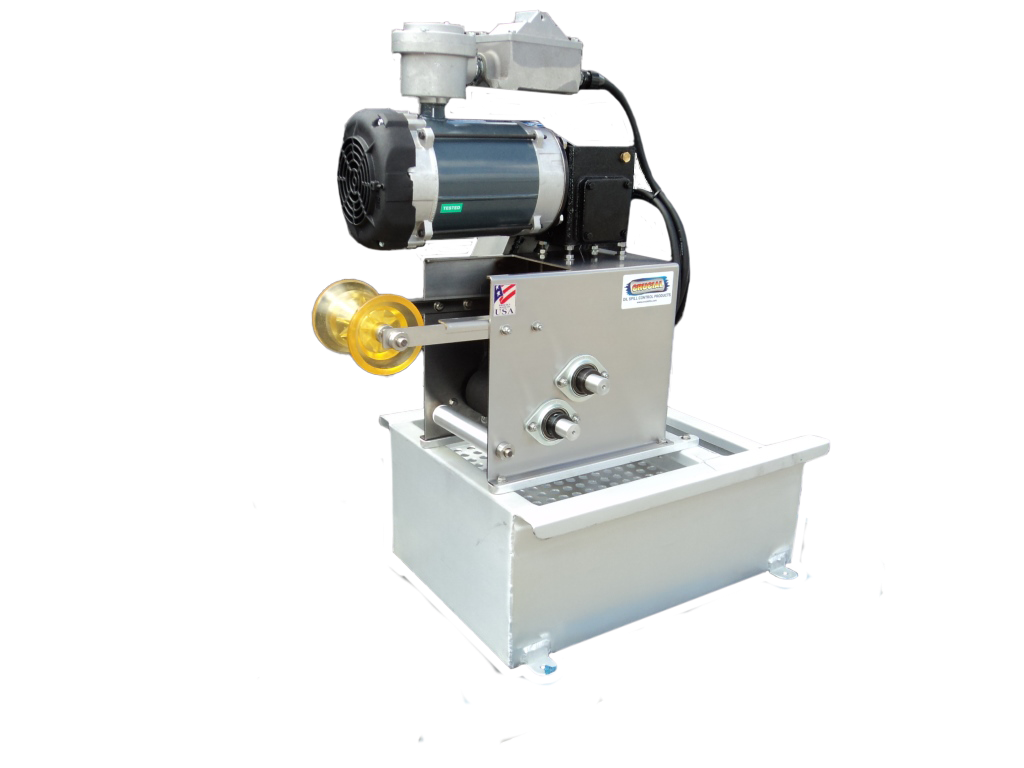 The wringer unit continuously rotates the oleophilic mop across the water’s surface and around a floating or